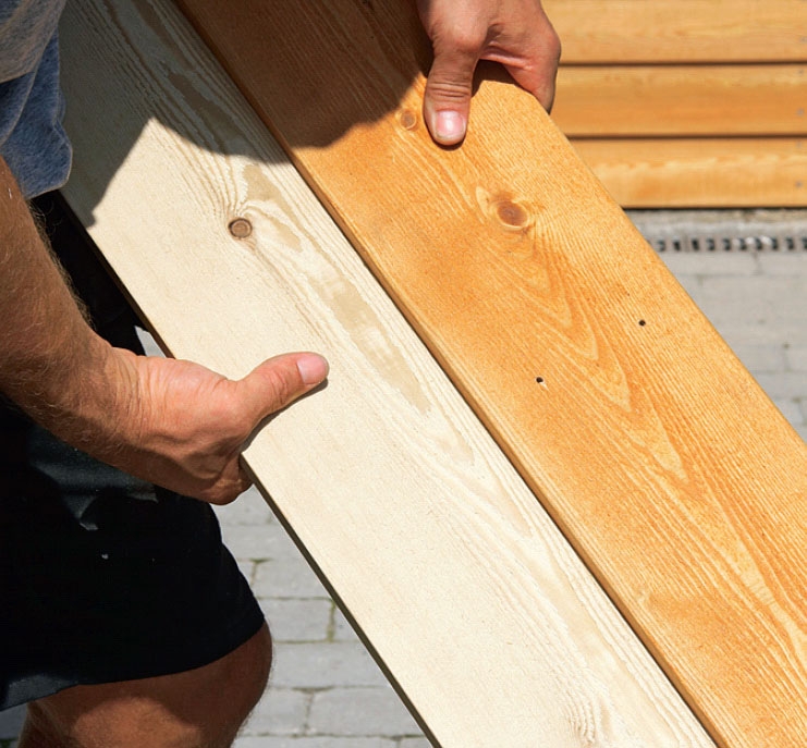 Vi strök brädorna med infärgad träolja. Dels förlänger oljan träets livslängd, dels skyddar kulören mot uv-strålar samtidigt som den ger lite liv. Låt oljan få sugas in i brädorna ett par dagar. Glöm inte att behandla ändträet!