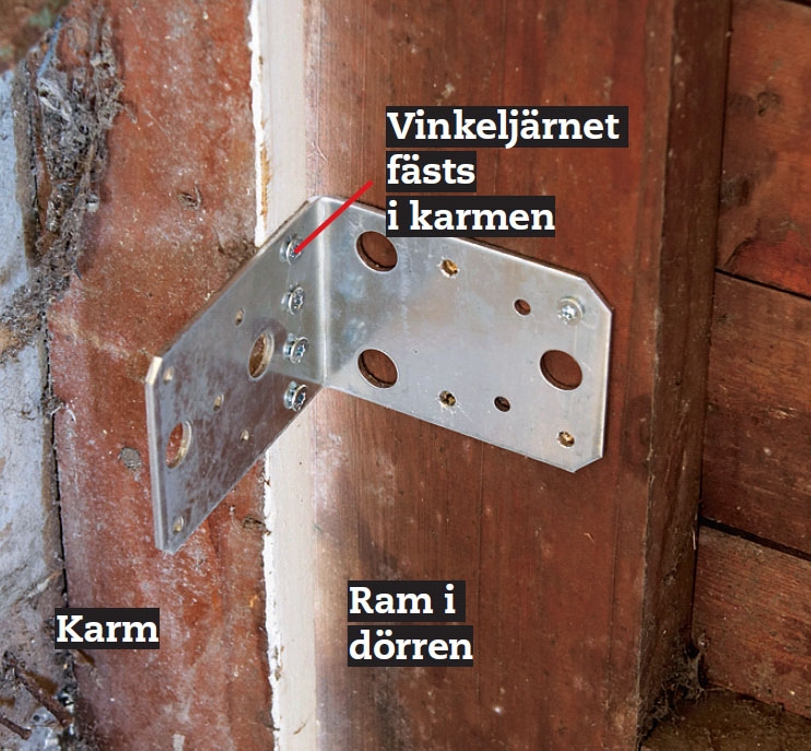 Ett vinkeljärn i vardera sidan på ramens insida ser till att ramen förblir vinkelrät och inte ändrar läge när vi plockar bort den utvändiga beklädnaden. Vippbeslaget förmår inte hålla dörren i läge så vinkeln är nödvändig.
