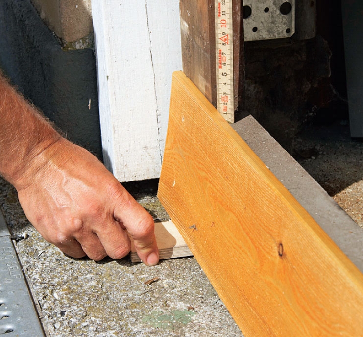 Den första brädan sätts på så att den sitter rakt och vågrätt på ramen. Om stenbeläggningen är ojämn eller sluttande kan det vara nödvändigt att såga till brädan så att den följer underlaget.