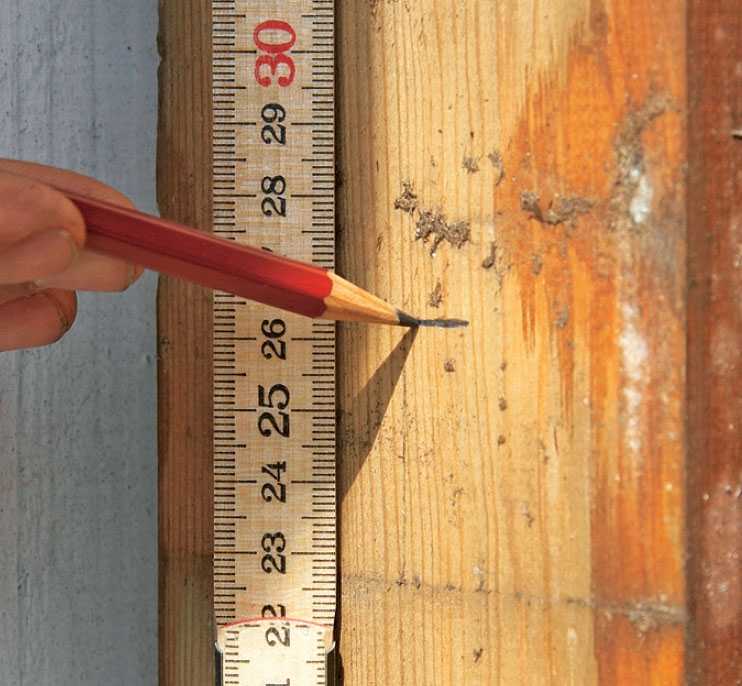Det är lätt att montera brädorna. Man skall bara hålla ena sidan längs strecket och fästa en skruv. Sedan gör man likadant på den andra sidan innan man fäster resten av skruvarna.