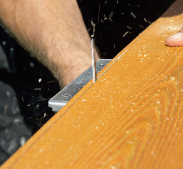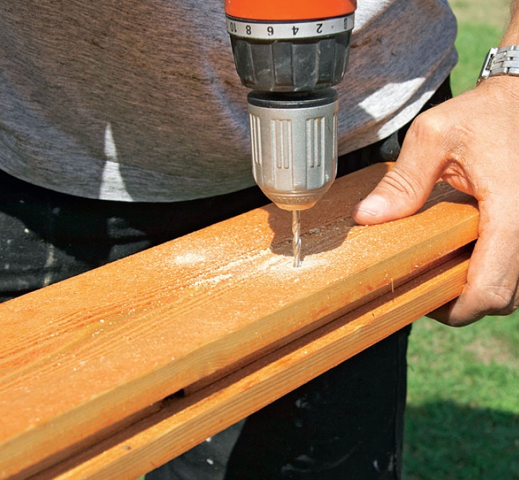 Vi använder en bräda som borrmall för att få alla skruvarna att sitta snyggt och i rak linje. Om man förborrar med ett borr som är 1 mm större än skruven gör det inget om träet krymper.