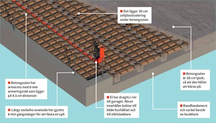 Garaget har byggts på en isolerad platta som består av 30 cm isoleringsmaterial och 20 cm betong. Plattan har gjutits innanför en sockel av lecablock som ligger i tre skift. Längs sockelns ovansida har gjutits in gängstånger som ska användas senare.