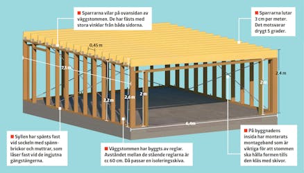 Vänster sida av byggnaden är högre. Eftersom taket ska luta lite är den högra väggen 20 cm lägre än den vänstra.