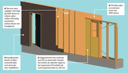 Beklädnaden är skivor, läkt och fibercementbrädor