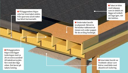 Taket är klätt med troldtekt, osb-skivor och papp