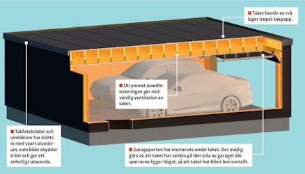 Garaget har försetts med ett papptak bestående av två lager papp som har bränts fast på ett lager konstruktionsplywood. Taket avslutas dessutom med vindskivor och trekantsreglar av trä som har klätts med svart aluminium. På undersidan av sparrarna sitter tvärgående glespanel som bär upp innertaket. Brädorna har satts på en lång kil som följer sparrarnas lutning, så att glespanelen ligger vågrätt. Taket har isolerats med 20 cm mineralull. Till sist har Troldtekt-skivor monterats på glespanelen.