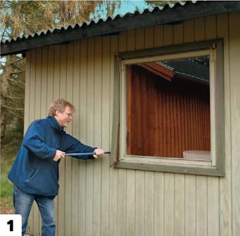 När alla material har köpts in kan du börja med stugan. Först tas fönster- och dörrfoder bort med en kofot.