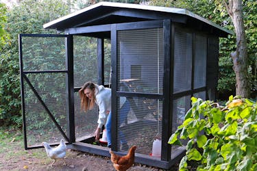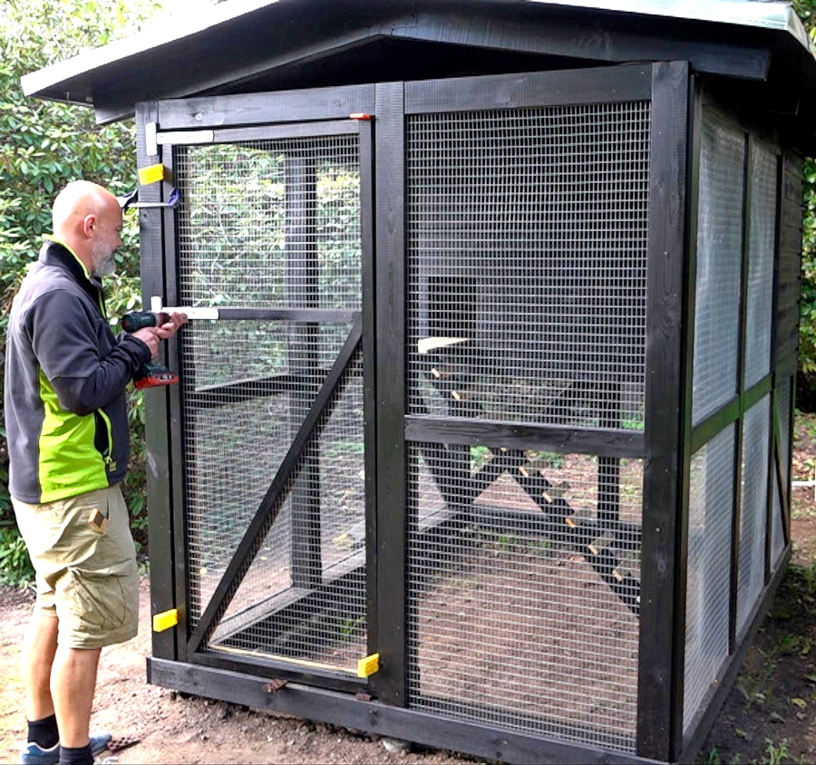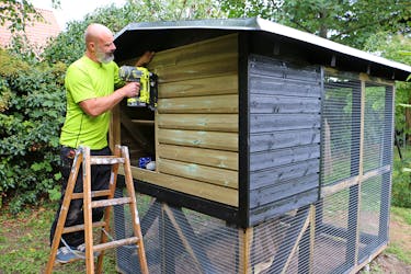 Hönsnätet häftas fast och klipps till. Det klipps lättast med en plåtsax. Bor du i ett område där det finns mårdar är det en bra idé att även stänga längs taket.