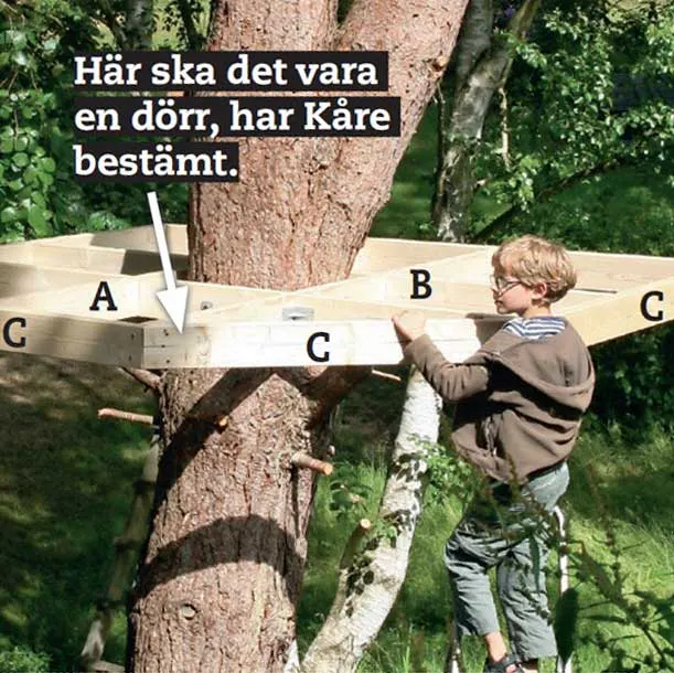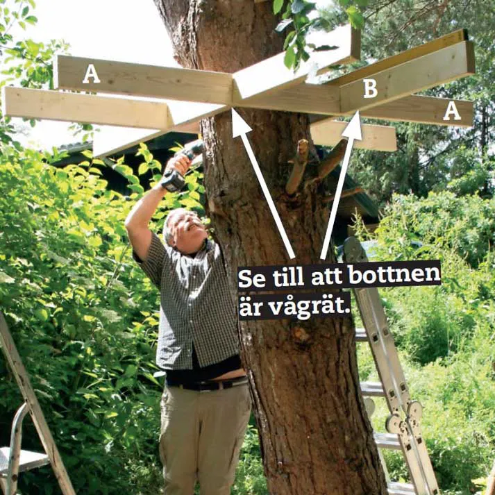 Det viktigaste är bottnen, som här är cirka 180 x 180 cm och består av ett bjälklag av reglar. Det sätts ihop av två tvärgående och två längsgående reglar (A och B) med hack-ihack-fogar runt stammen och fästs i den med skruvar. Därefter stabiliseras bjälklaget med snedsträvor, så att du kan bygga vidare.