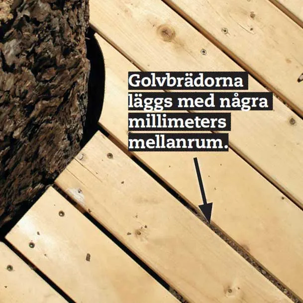 Golvet är av hyvlade brädor, som läggs med några millimeters mellanrum, så att ev. regnvatten kan rinna bort.
