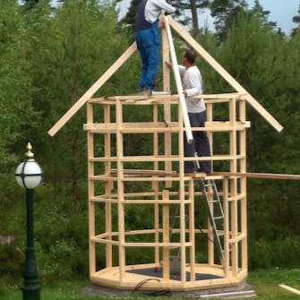 Den åttkantiga formen uppstår genom att såga syllen på fundamentet, så att var och en av de åtta delarna har 22,5 graders vinkel i varje ände. Det blir totalt 16 snitt, och 16 x 22,5 blir 360 grader, alltså en hel cirkel.