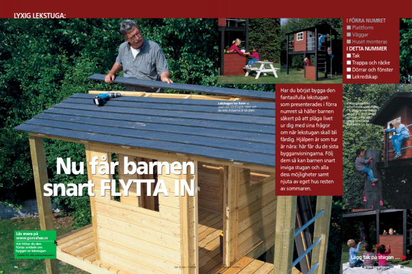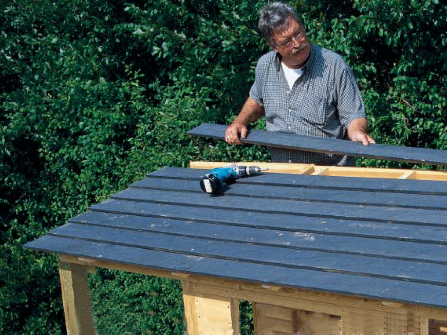 Taket på lekstugan kläs med lärkbrädor som först stryks med olja och sedan laseras två gånger med heltäckande lasyr. Du behöver inte välja lärk - det går lika bra med furu. Brädorna läggs nerifrån och uppåt med en liten överlappning. Det kallas för klinkläggning och gör det lätt för regnvatten att rinna undan.