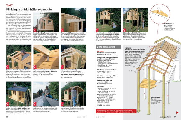 Taket läggs av brädor som har oljats och strukits med utelasyr. Lägg brädorna på klink, alltså med överlappning. Börja vid takfoten och fortsätt mot nocken. Den nedersta brädan sticker ut 5 cm från sparrarna.