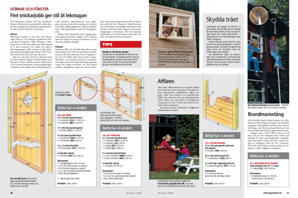 Remmarna (B) fästs på väggarna i nivå med ovankanten. Välj 50 mm skruvar. Fäster du skruvarna i reglarna kan skruvarna vara längre. Hörnstolpen (D i föregånde nummer) sågas av med urtag i nivå med remmen, som fästs med 4,5 x 70 mm skruvar.