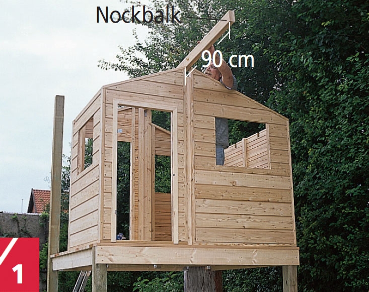 Nockbalken (A) placeras i urtagen som bildats ovanpå gavelns avståndslister. Den sticker ut 90 cm från gaveln mot trappan och 35 cm från den andra gaveln. Se till att gavlarna är lodräta och fäst nockbalken med vinkeljärn på insidan av väggarna.