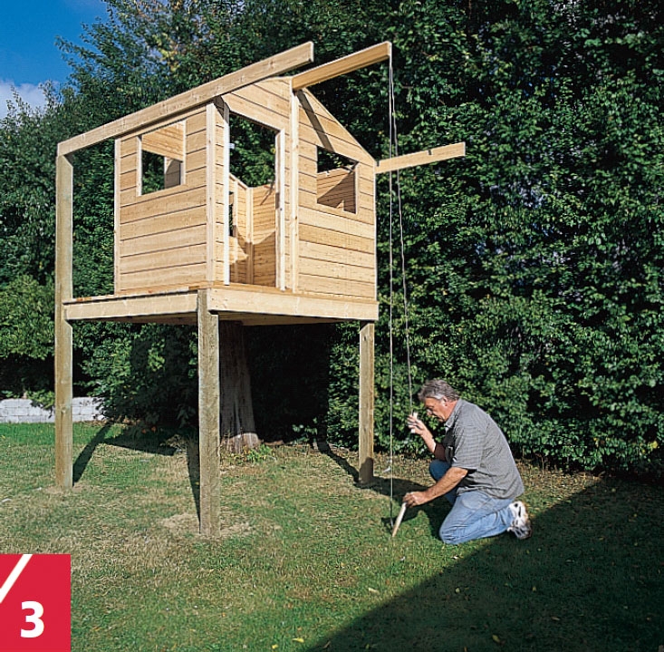 Fäst ett lodsnöre i nockbalken och sedan i remmarna och loda rakt ner till marken. Då får du exakt placering för de tre sista stolparna (C, E och F från föregående artikel). Gräv sedan cirka 90 cm djupa hål för de tre stolparna.