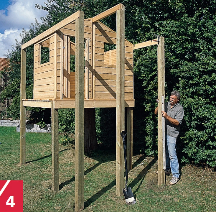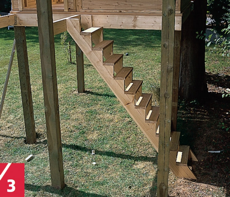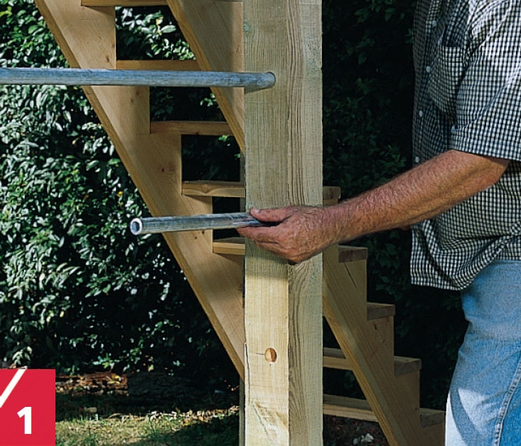 För säkerhets skull har trappan kompletterats med en handledare bestående av ett rör. Detta fäster du i väggen på lekstugan och en stolpe. Använd rörhållare. Handledaren sitter 70 cm ovanför trappan och öppningarna täpps igen med rundstav och träkulor.