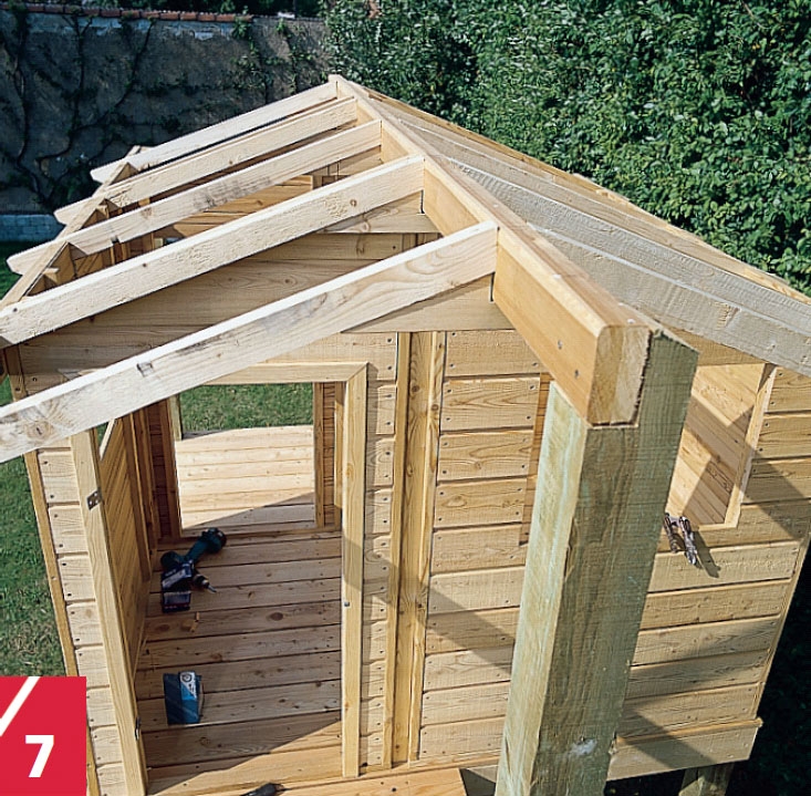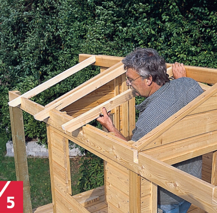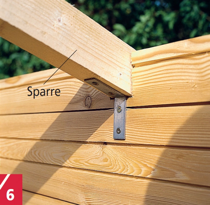 Lägg sparrarna i urtagen och skjut upp dem mot nockbalken. Skruva sedan fast sparrarna på insidan av väggarna. Använd 15 x 50 mm vinkeljärn och 3,5 x 20 mm skruvar.