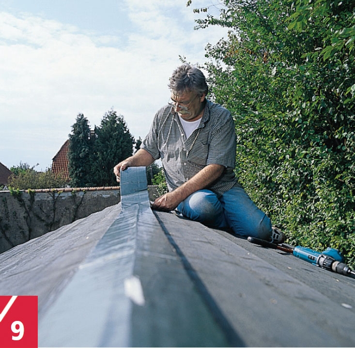 När du kommer upp till nocken täcker du skarven mellan de två brädorna på var sin sida av nocken med en remsa självhäftande takpapp.