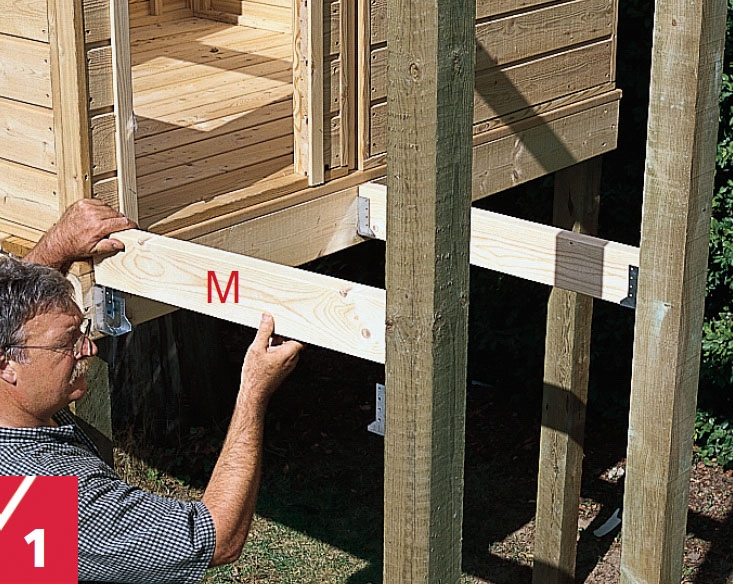 Trappan monteras så att den kommer i nivå med ovankant på bjälken (M) på plattformen. Dra i två 6 x 120 mm skruvar i varje vang från bälkens baksida och fäst ena vangen dessutom i väggen och i stolpen.