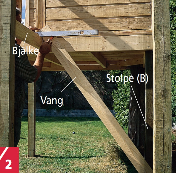 De två vangerna (sidorna) är av tryckimpregnerad furu i dimensionen 38 x 150 mm. Lutningen på vangerna räknar du ut efter instruktionerna under bild 2 till höger. Därefter kan du såga urtag för planstegen.
