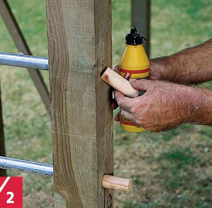 Sätt stolparna lodrätt och kapa dem i rätt längd. Såga samtidigt urtag i toppen på stolparna för nockbalken (A) och remmarna (B). Fäst sedan nockbalk och remmar med 4,5 x 70 mm skruvar.