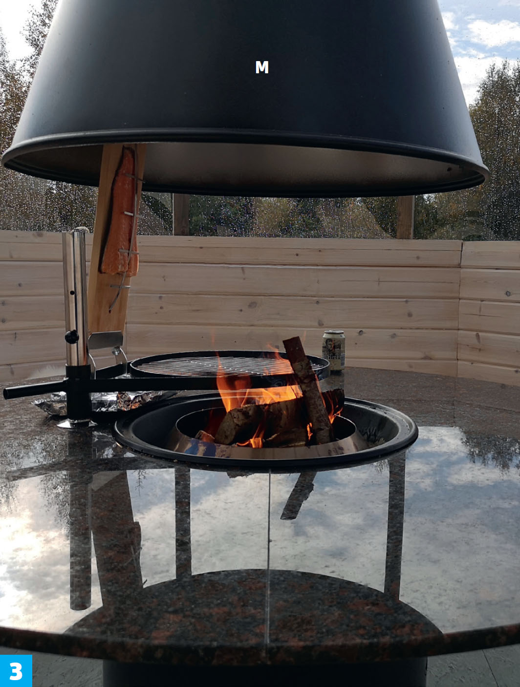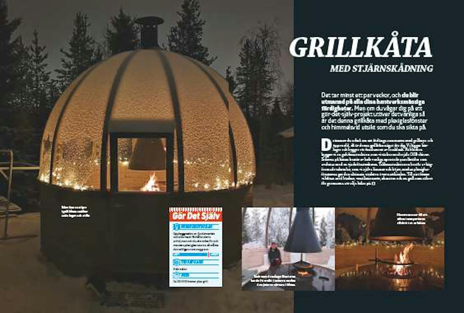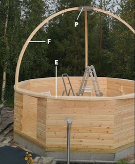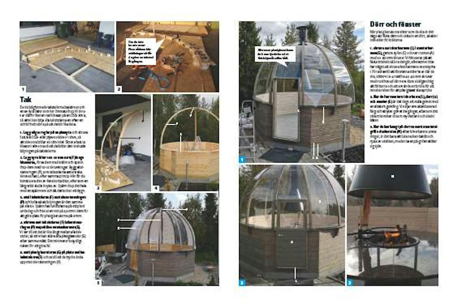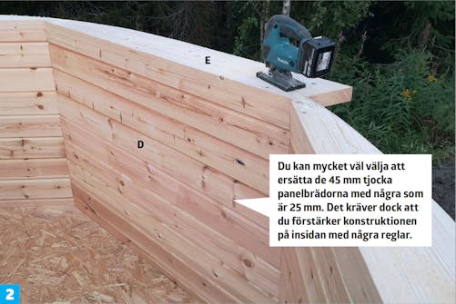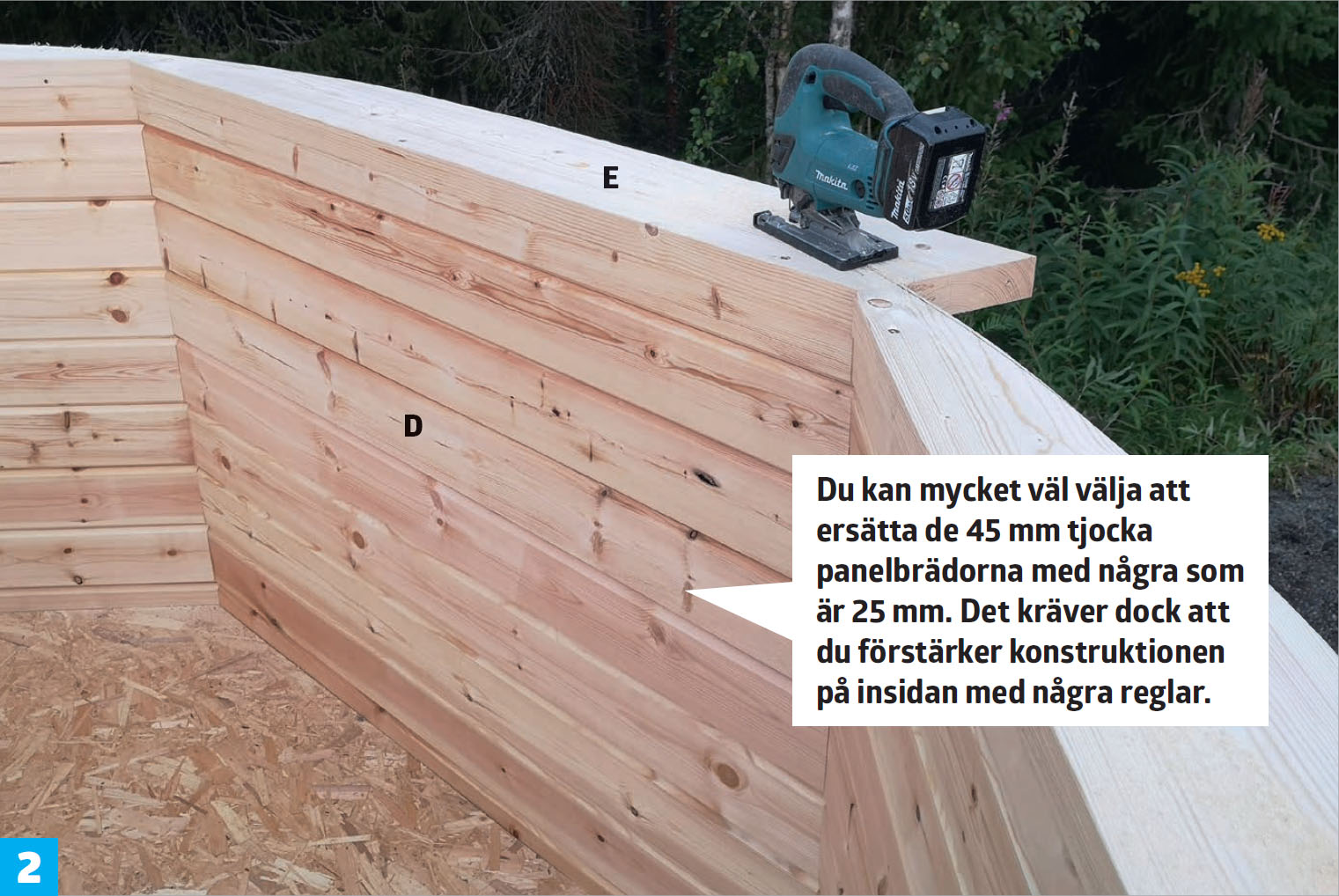När du har monterat alla panelbrädor (D) är det dags att skruva fast fönsterkarmen (E). Vi har valt en 45 mm tjock karm av massiv furu. När karmen har fästs i panelbrädorna kan du direkt känna hur hela konstruktionen förstärkts. För att få grillkåtan att se rund ut väljer vi att runda av karmen med en sticksåg. Se till att mäta noggrant och markera med blyerts. Det är viktigt att mätningen blir likadan på alla sidor för att få det mest enhetliga resultatet.