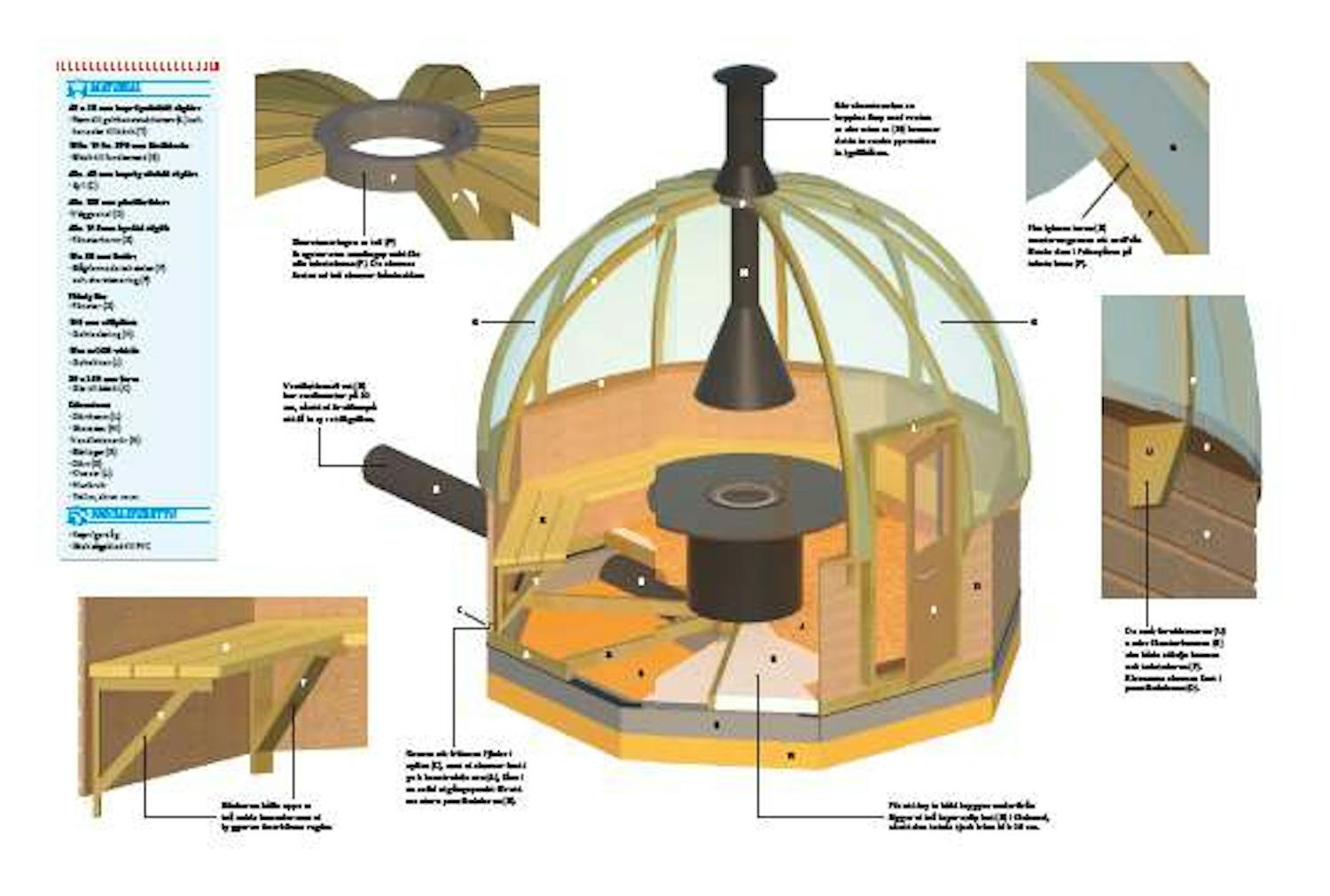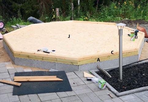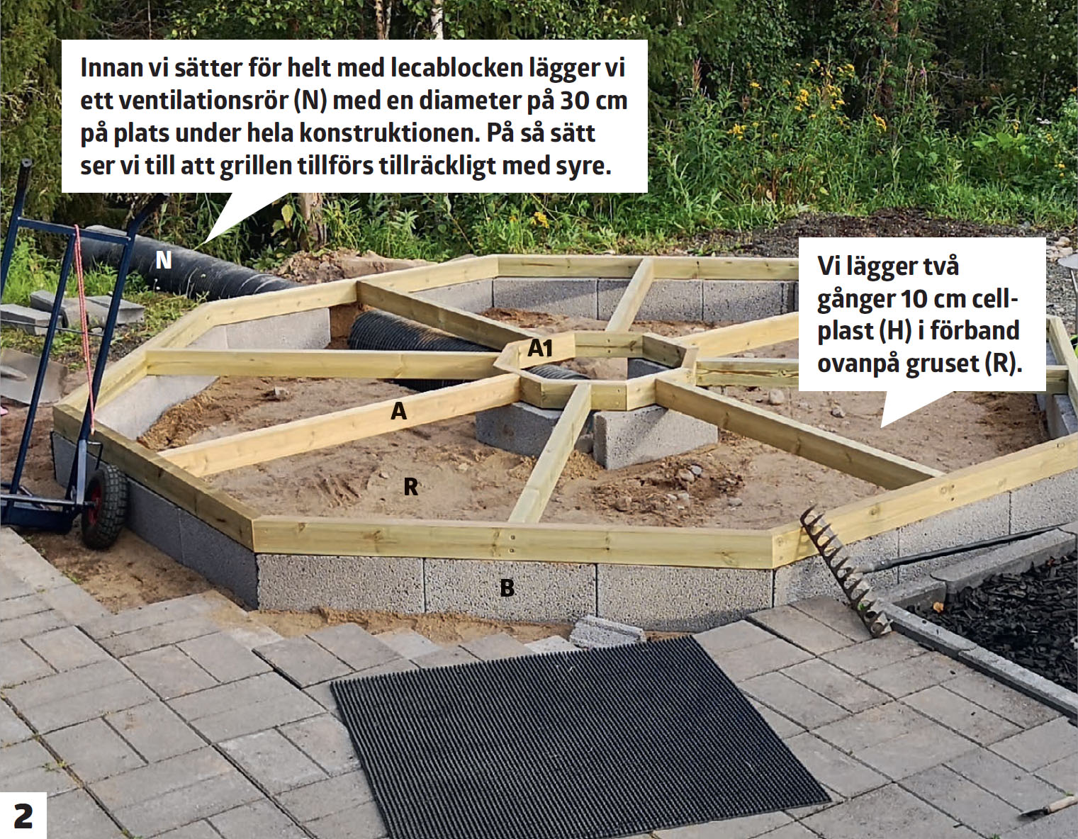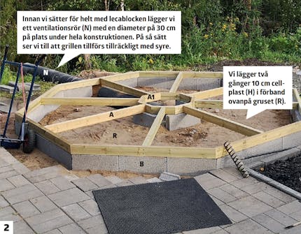 Lägg 5-10 cm bärlager (R) och se till att underlaget är helt plant. Lägg den åttkantiga ramen på gruset och dra ett streck på utsidan, så att du kan se var lecablocken (B) sedan ska placeras. Ställ lecablocken ett efter ett och använd helt vanligt murbruk till fogarna. Kolla regelbundet med ett vattenpass om blocken är i lod och våg, och låt dem därefter torka i ett dygn. Nu kan du lägga ramen på plats och skruva ihop den med rostfria 5 x 90 mm träskruv. När det hela sitter som det ska är det bara att isolera under ramen med 20 cm cellplast (H).