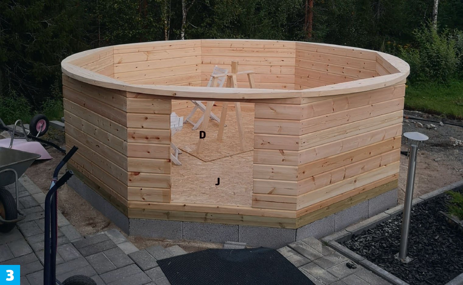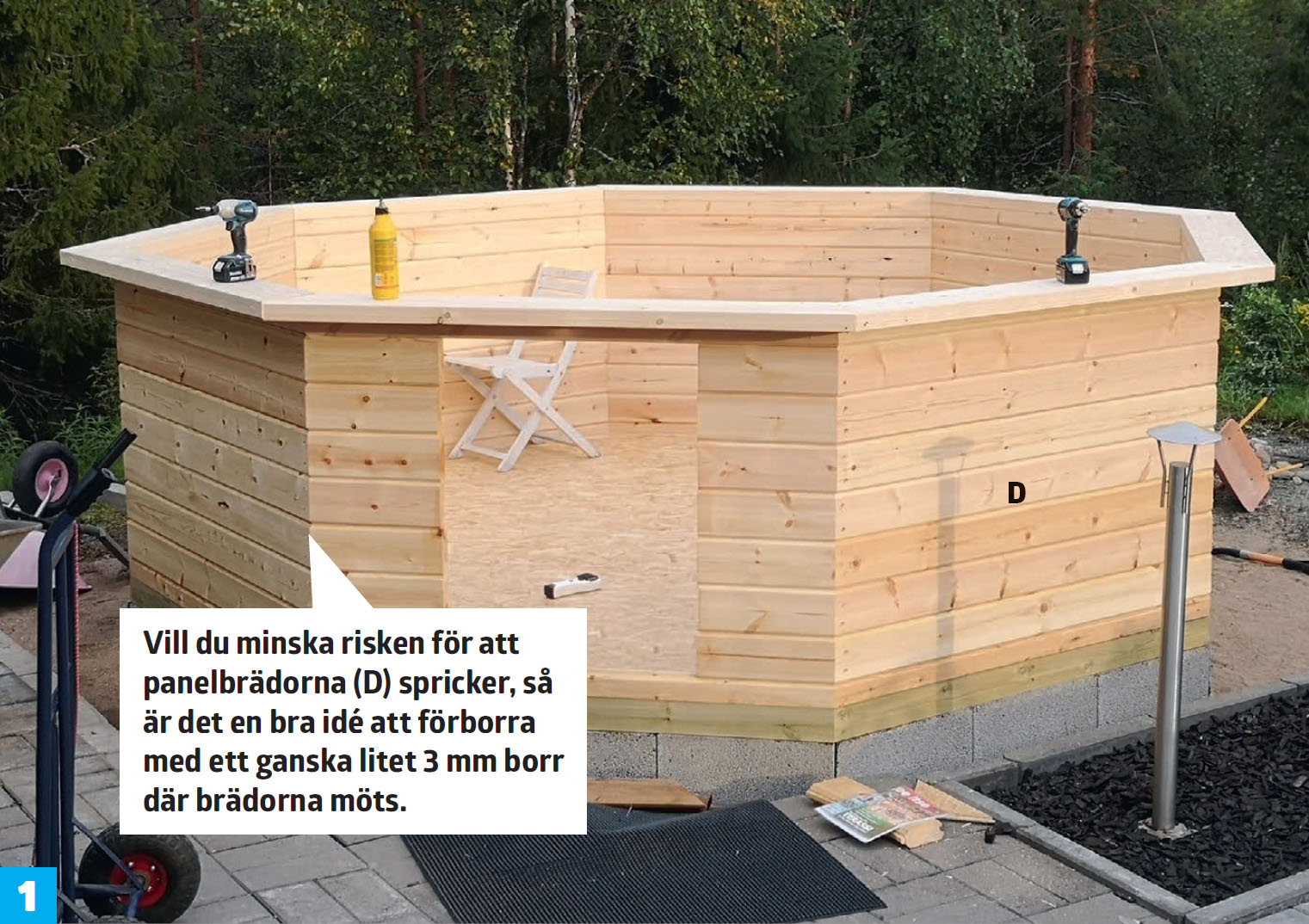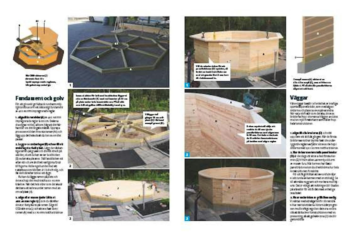 För att göra vår grillkåta så rund som möjligt konstruerar vi ett åttkantigt fundament av 45 x 95 mm impregnerade reglar.