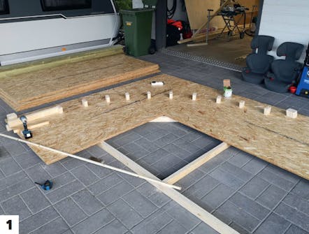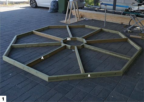 Såga åtta ramdelar (A) av 45 x 95 mm impregnerade reglar à 150 cm. Delarna ska sågas i vinkel, så kom ihåg att det här handlar om det längsta måttet. Upprepa processen vid den innersta ramen (A1) och lägg upp det hela så att du kan se om det passar.