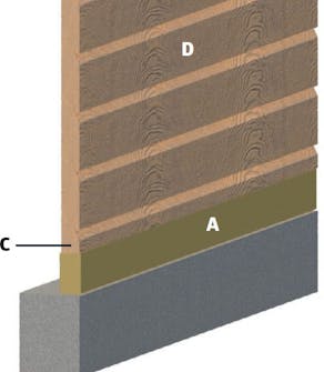 Ovanpå ramen (A) sätter vi en 45 x 45 mm syll (C), som vi fräser en fjäder i. På så sätt får panelbrädorna något att stå fast i.