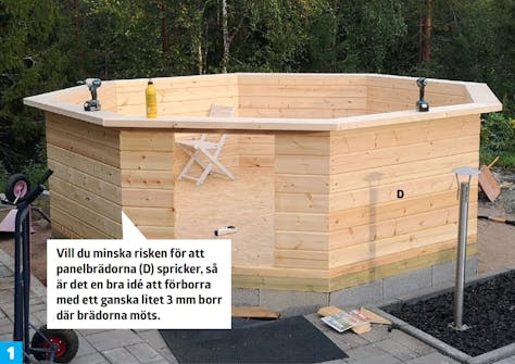 Såga till alla brädorna (D) och sätt upp dem ett skift åt gången. När de första brädornas not har tryckts fast i de underliggande reglarnas fjäder skruvas de ihop i ändarna med 3,5 x 50 mm rostfria träskruv.