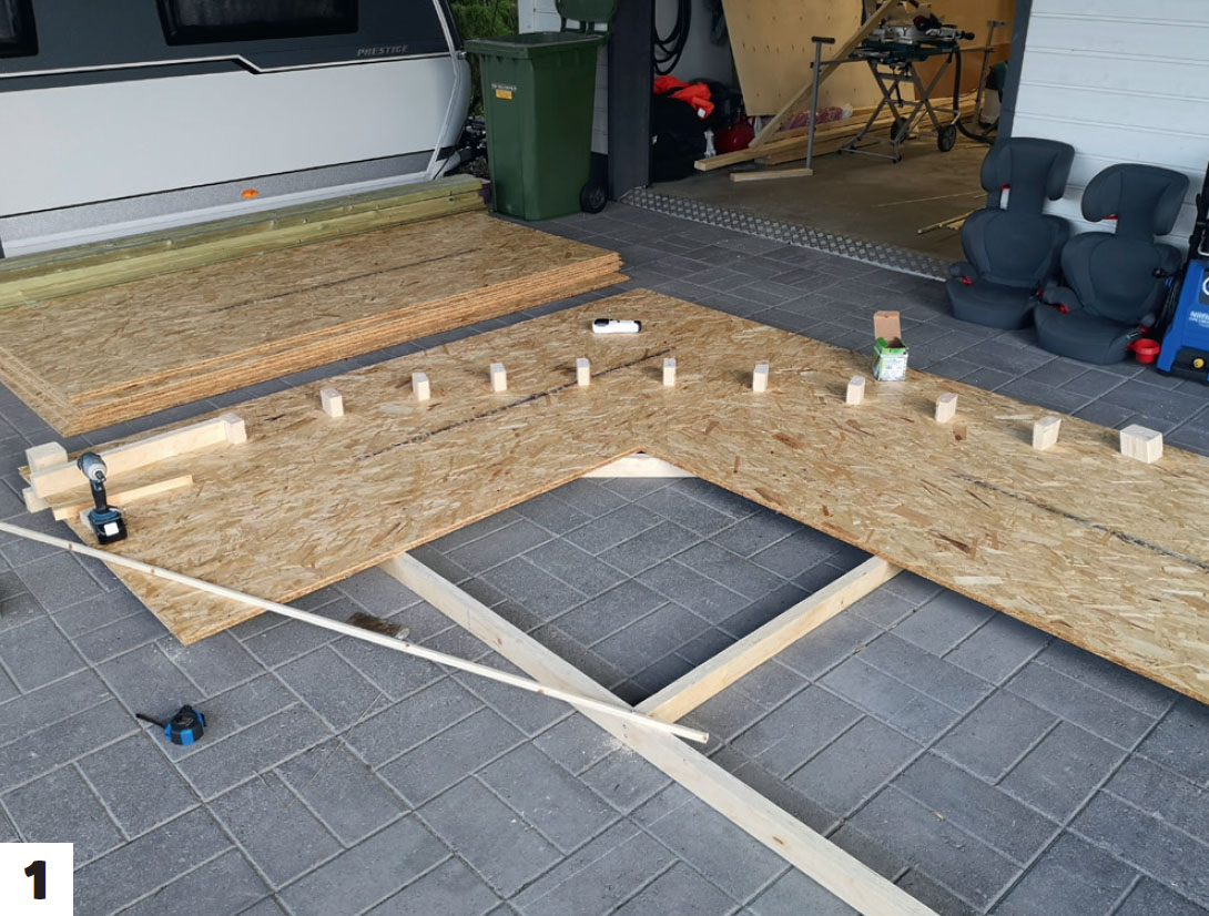 De tio bågformade takstolarna består var och en av fyra lister som har limmats ihop. Vi skruvar därför fast en rad klossar på en OSB-skiva, så att vi kan böja alla takstolarna en efter en och bli helt säkra på att de blir likadana.