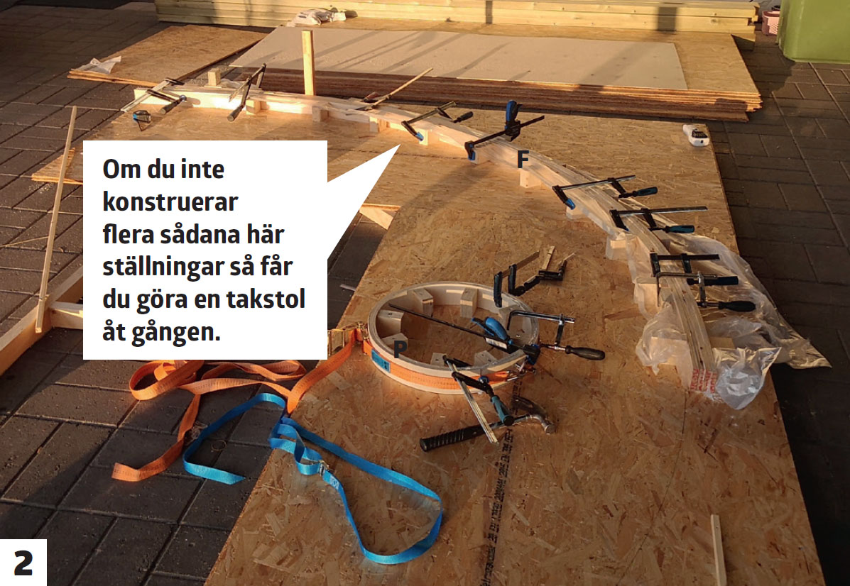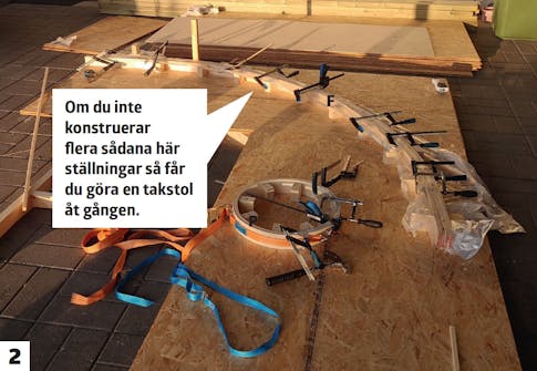 Lägg några reglar på en plan yta och skruva fast två OSB- eller plywoodskivor i dem, så att skivorna bildar en rät vinkel. Skruva fast 12 klossar i skivorna så att de bildar den önskade böjningen på takstolarna.