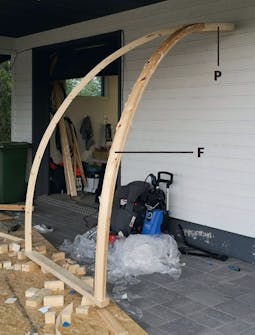 Ställ takstolarna (F) mot skorstensringen (P) och kolla så att böjningen är den samma på alla tio. Spänn fast takstolarna på ett plant underlag och fräs ut en not på 3,5 mm i dem för att göra plats för plexiglasrutorna på 3 mm.