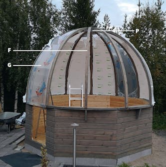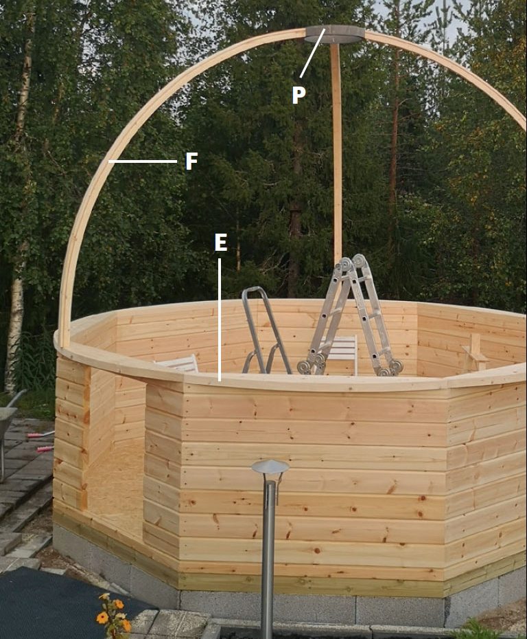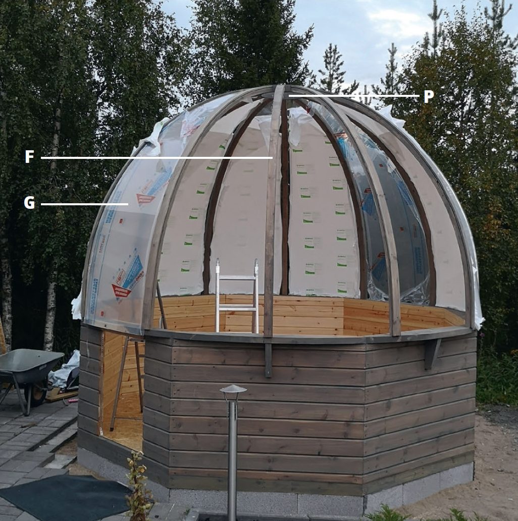 Skruva fast takstolarna (F) i skorstensringen (P) respektive fönsterkarmen (E). Vi ser till att det är lika långt mellan alla takstolar, så att vi kan skära alla plexiglasrutor (G) efter samma mått. Det minimerar betydligt risken för att göra fel.
