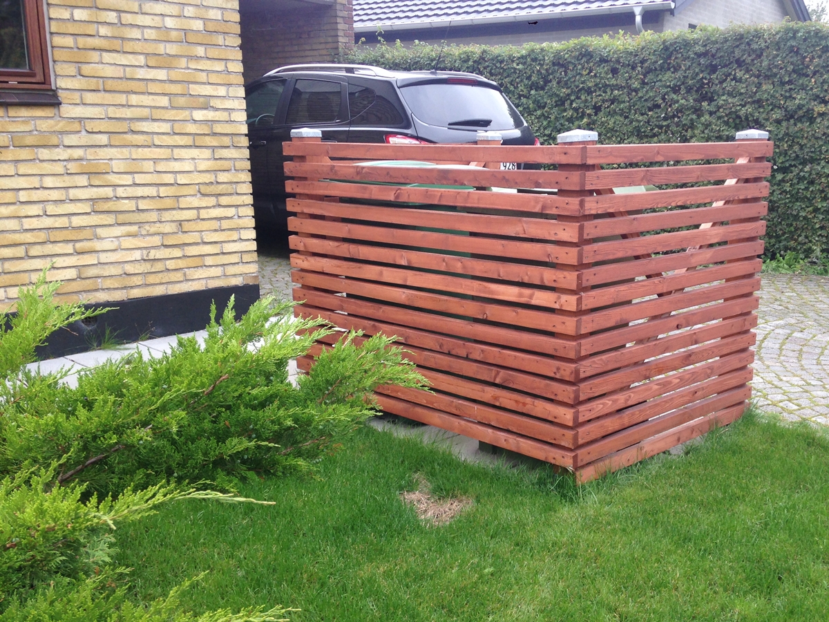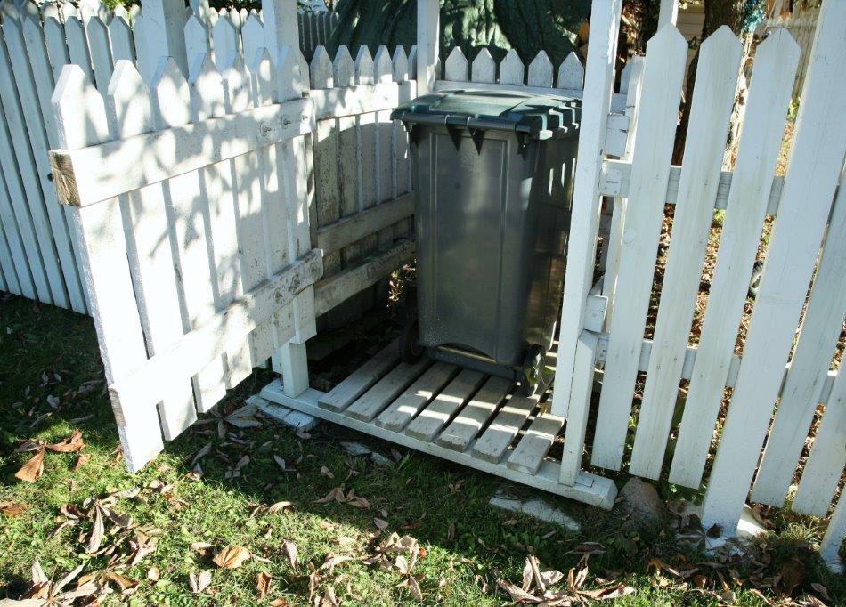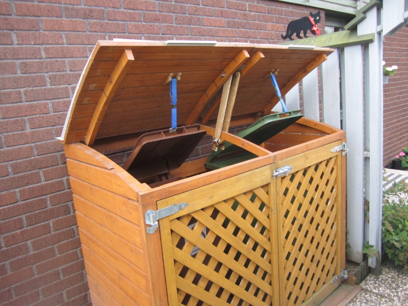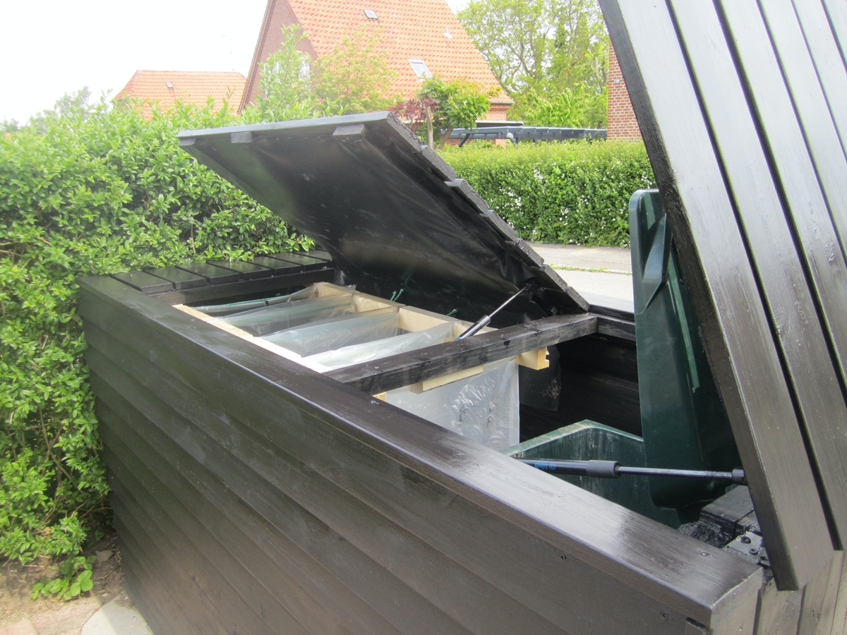 Den främre väggen på mitt sopkärlsskjul har gångjärn och hålls på plats med magneter. Själv sopkärlets lock följer – med hjälp av krokar och en metallkedja – med när "väggen" öppnas.