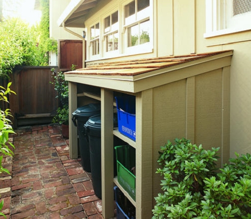 Det här enkla sopkärlsskjulet är byggt så att det passar in i omgivningen när det gäller form, material och färgval. Stenläggningen under skjulet består av röda cementplattor.