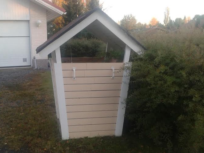 Mitt sopkärlsskjul är 1,9 meter högt, 75 cm brett och 80 cm djupt. Det är byggt av två dimensioner trä (45 x 70 mm och 48 x 48 mm). Botten och väggarna är gjorda av 6 mm plywood och allt är målat i samma färg.