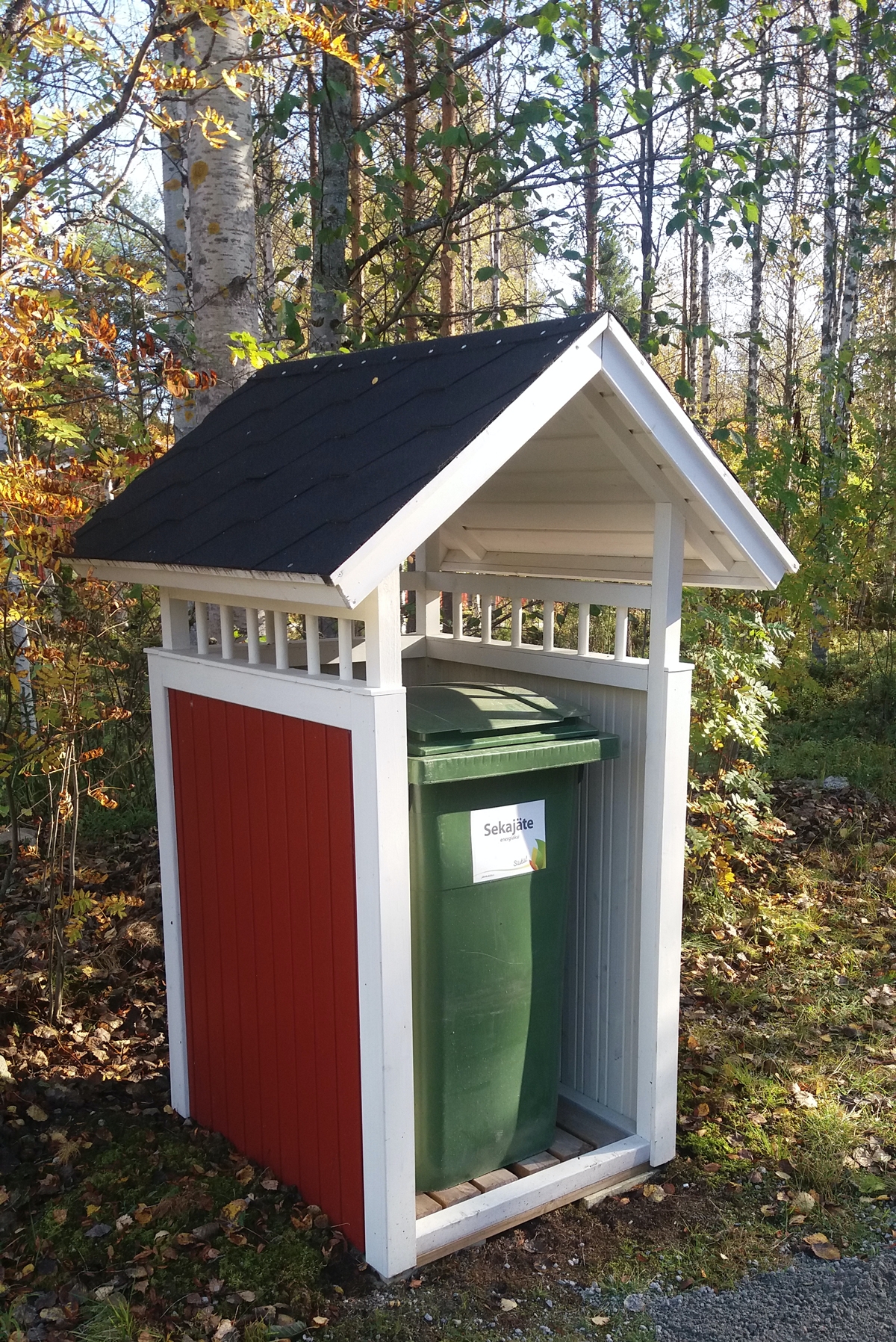 Locket har ett undertak, så att det inte regnar ned i säckarna. Sopkärlets lock har en mekanism, så att det öppnas automatiskt när skjulets lock öppnas.