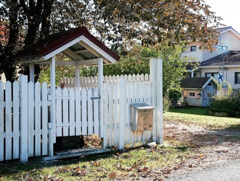 Sopkärlsskjulet är byggt som en integrerad del av staketet. Men grinden är höjd över marken, så att det går att öppna den även när det är mycket snö.