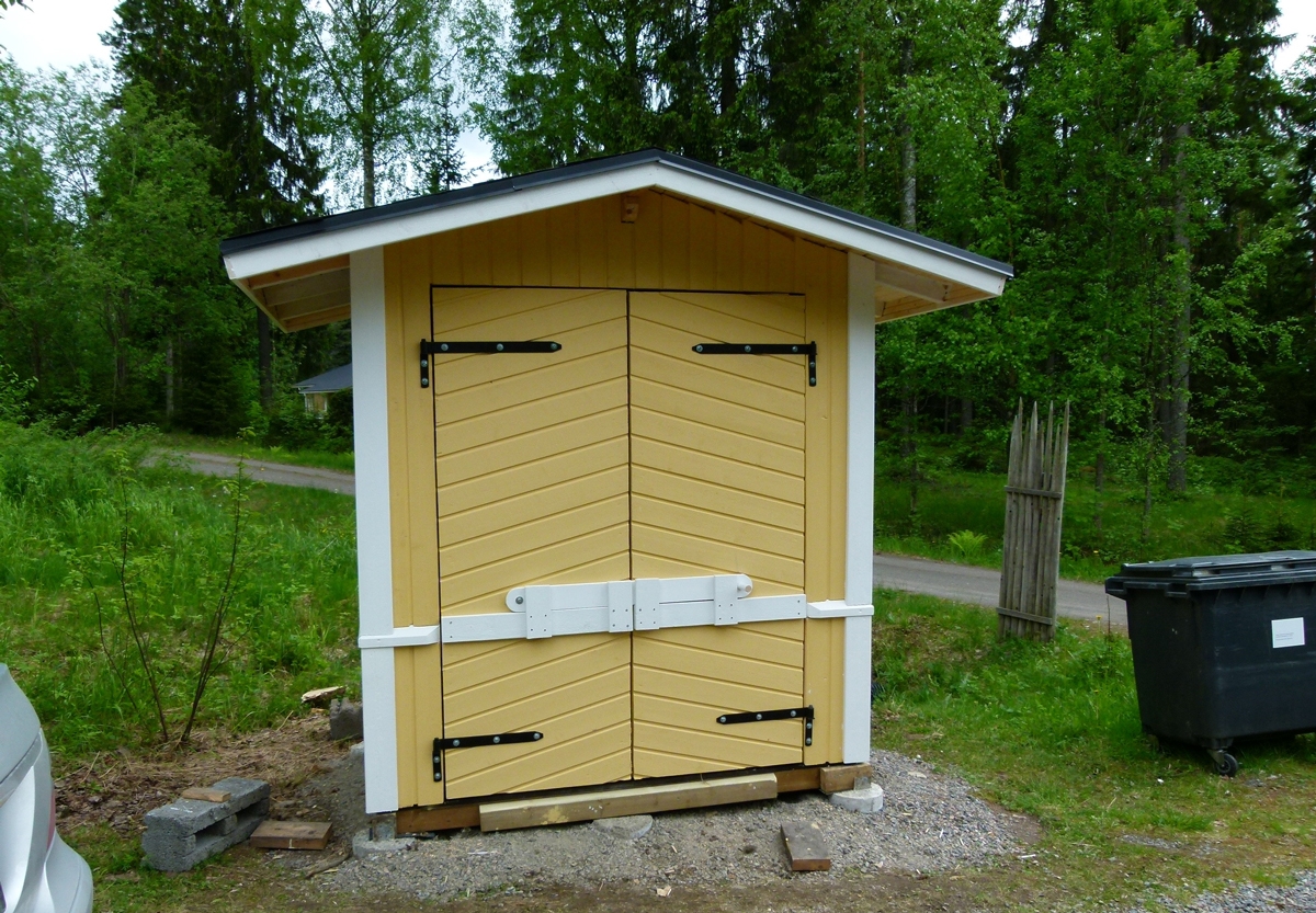 Det här sopkärlsskjulet är byggt så att det passar in med övriga byggnader på tomten. Skjulet är byggt på punktfundament av betong och väggarna består av brädor med spont och not. Taket är gjort av plywood klätt med takpapp.