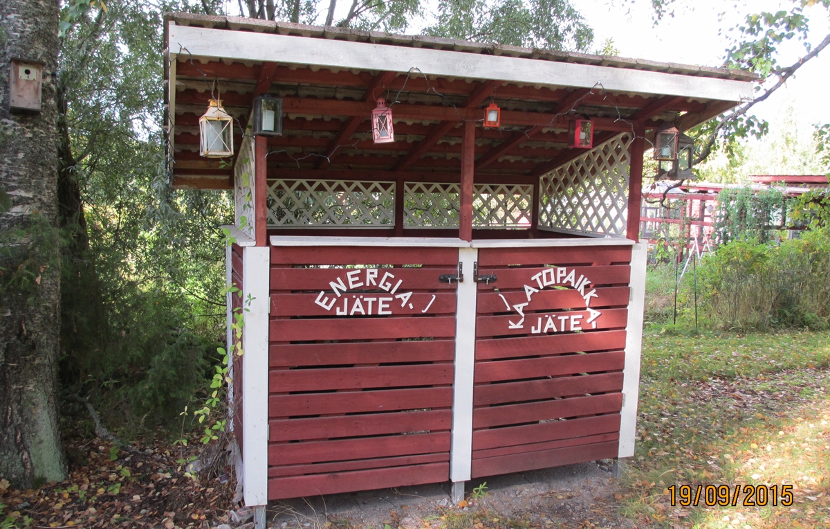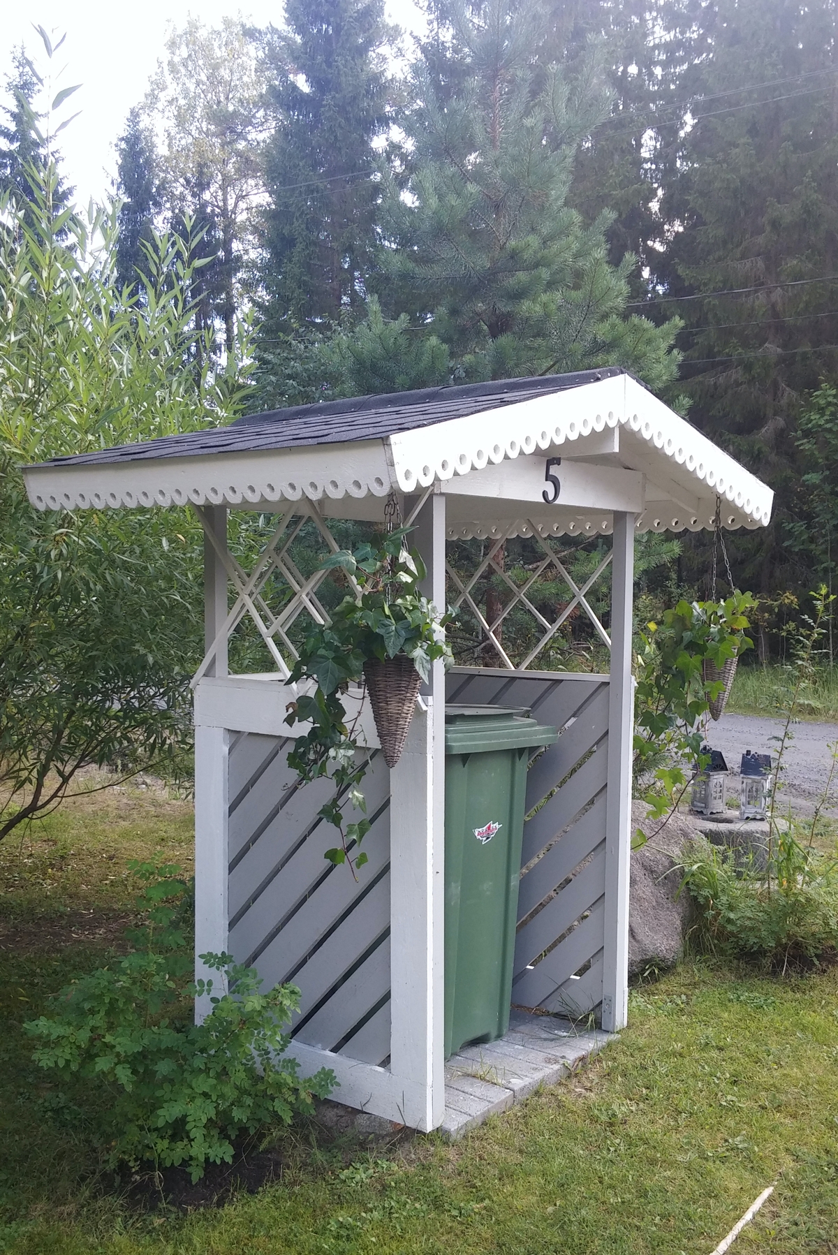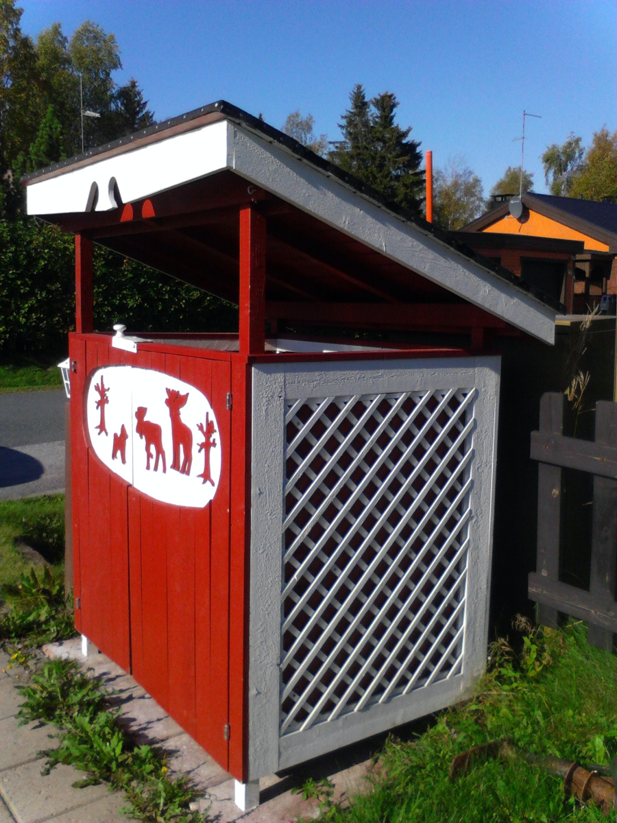 I somras byggde jag det här snygga sopkärlsskjulet. Dekorationen i taket gjorde jag med sticksåg och en hålborr i borrmaskinen.