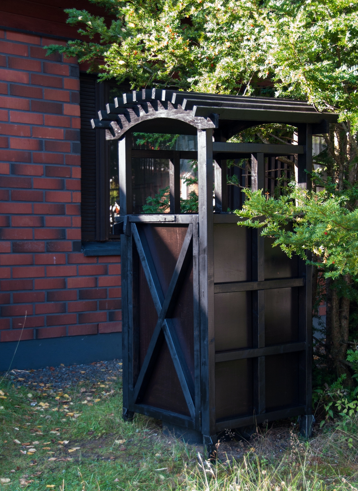 Vårt sopkärlsskjul skulle passa till husets mahognyfönster. Så jag byggde det i lärkträ, som jag sedan strök med linolja med ett brunt pigment.