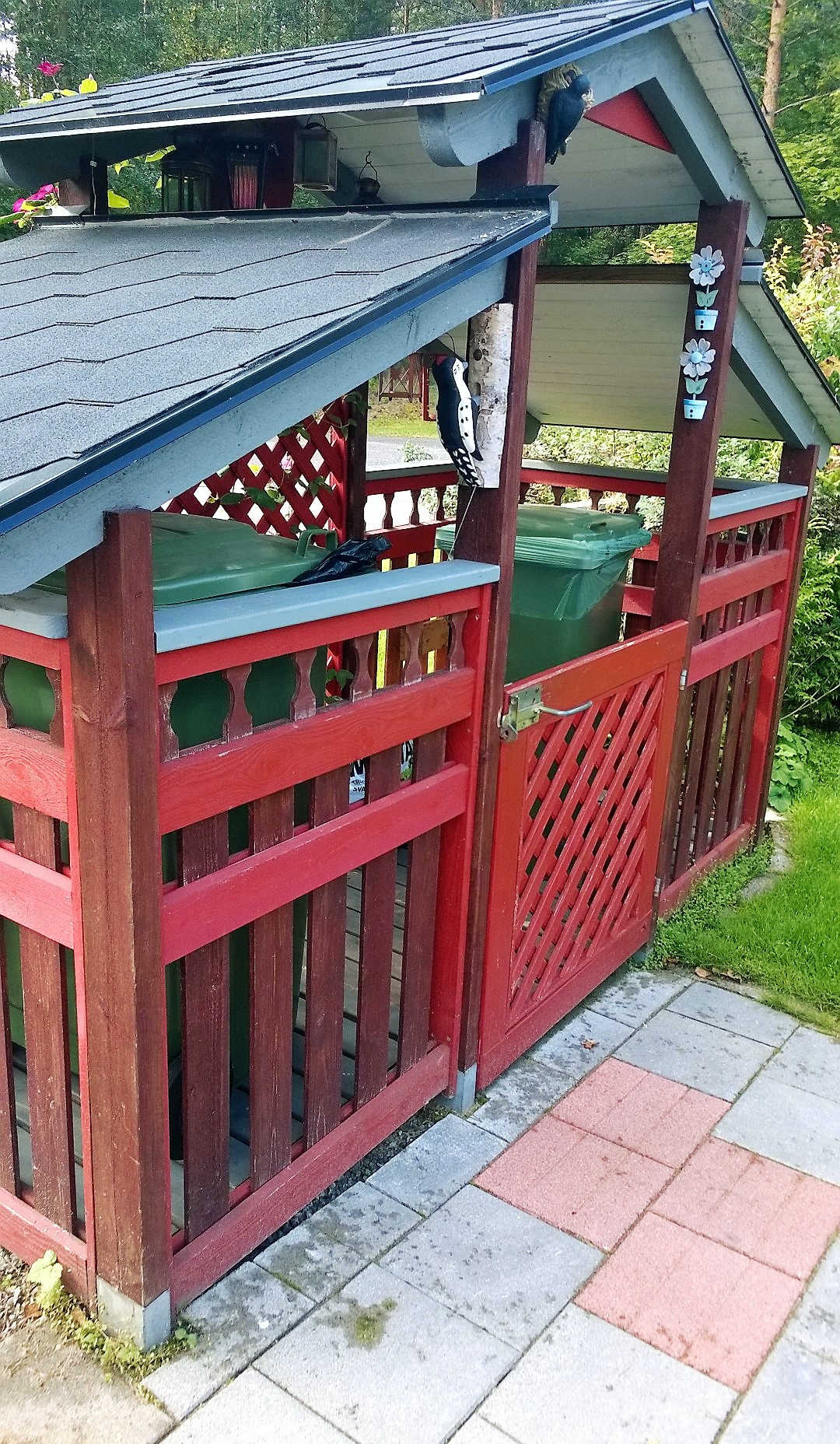 Vårt sopkärlsskjul har sidor som består av galler, så att det inte uppstår dålig lukt. Locket, som vi har dekorerat efter bästa förmåga, är uppdelat i två delar, så att det är enkelt att komma åt sopkärlen.
