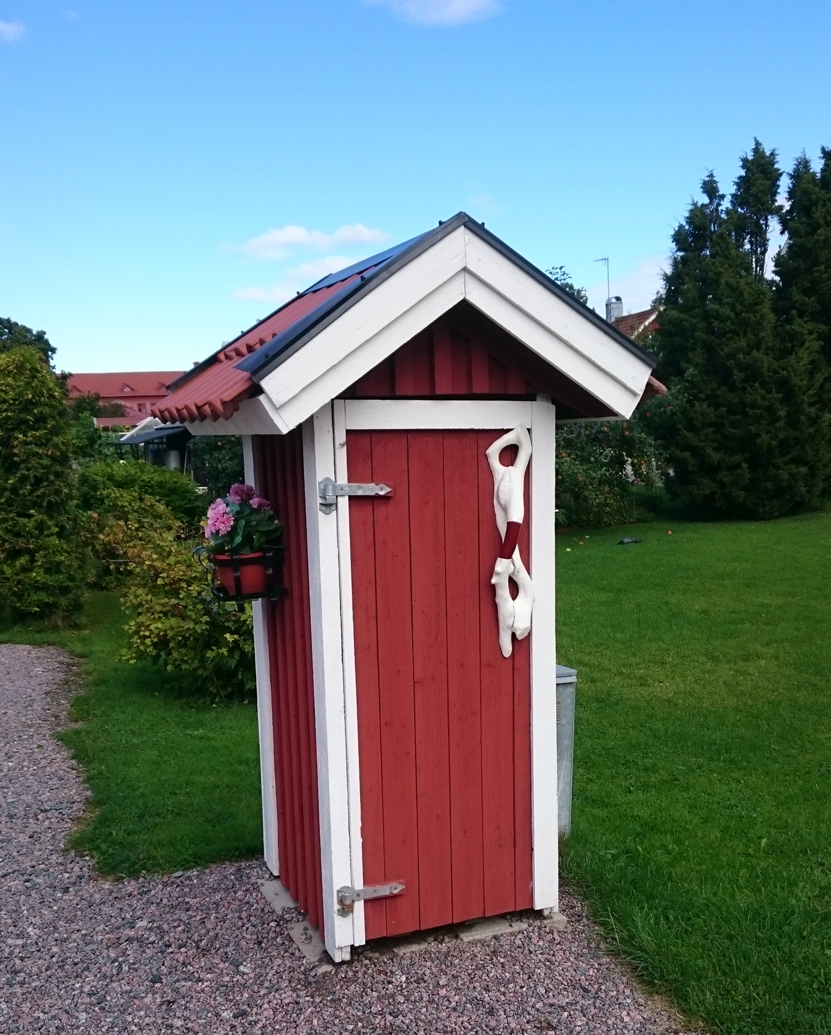 Mitt sopkärlsskjul har handtag av "ihåliga" björkgrenar som jag har hittat. Min plan var att sätta ett hjärta på dörren. Men det satte min sambo stopp för, av rädsla för att folk skulle missuppfatta dess funktion.