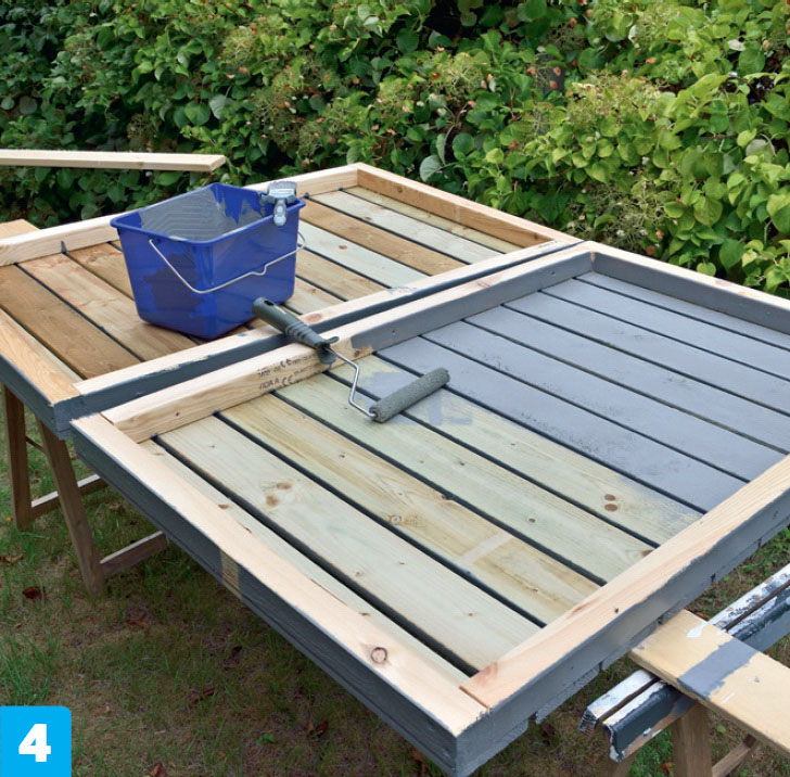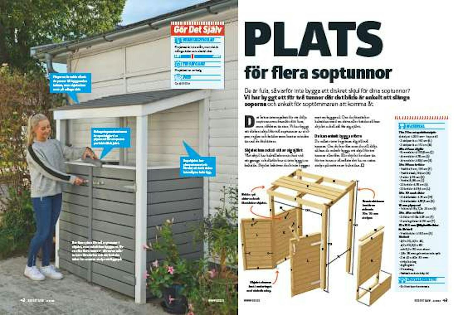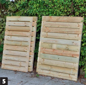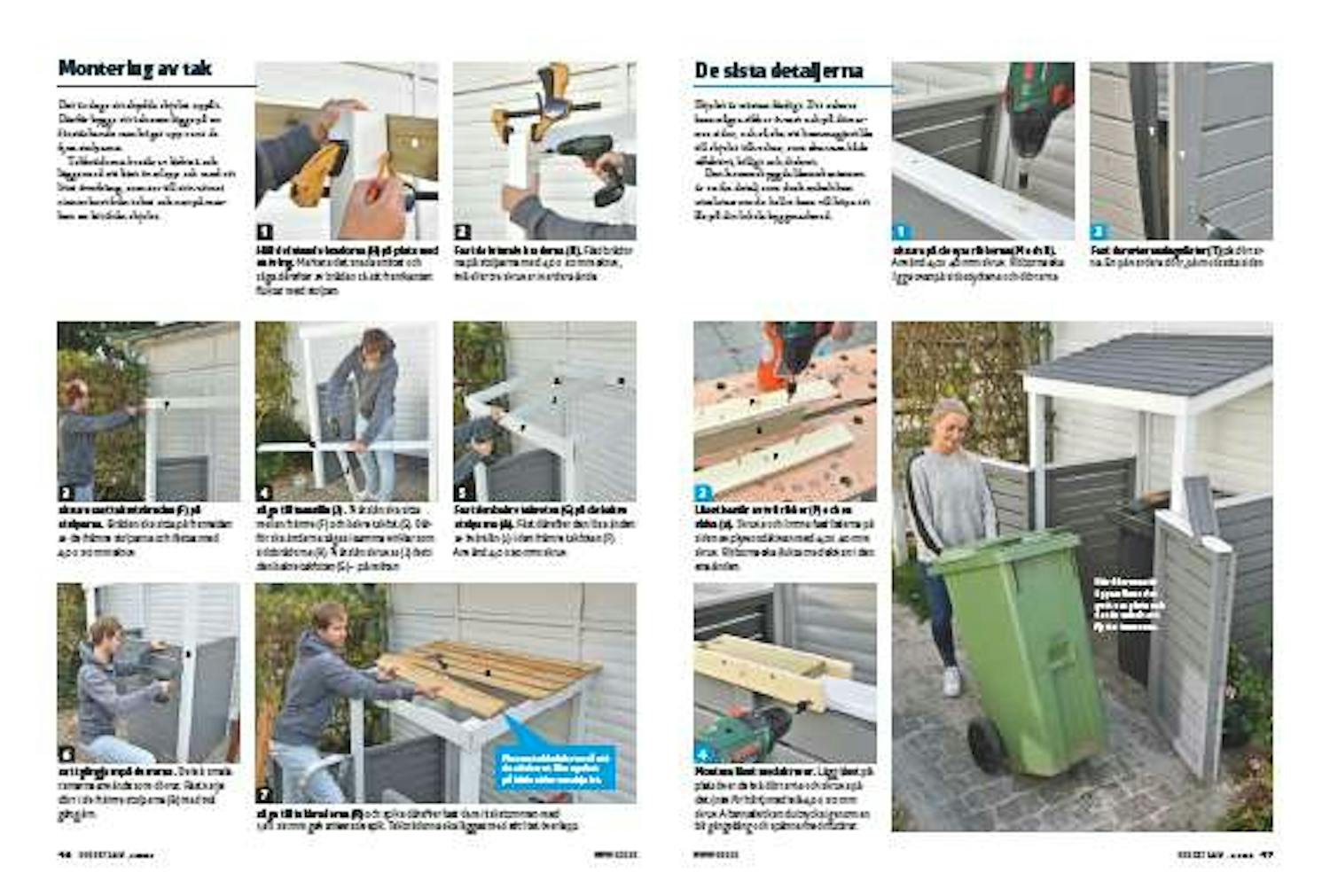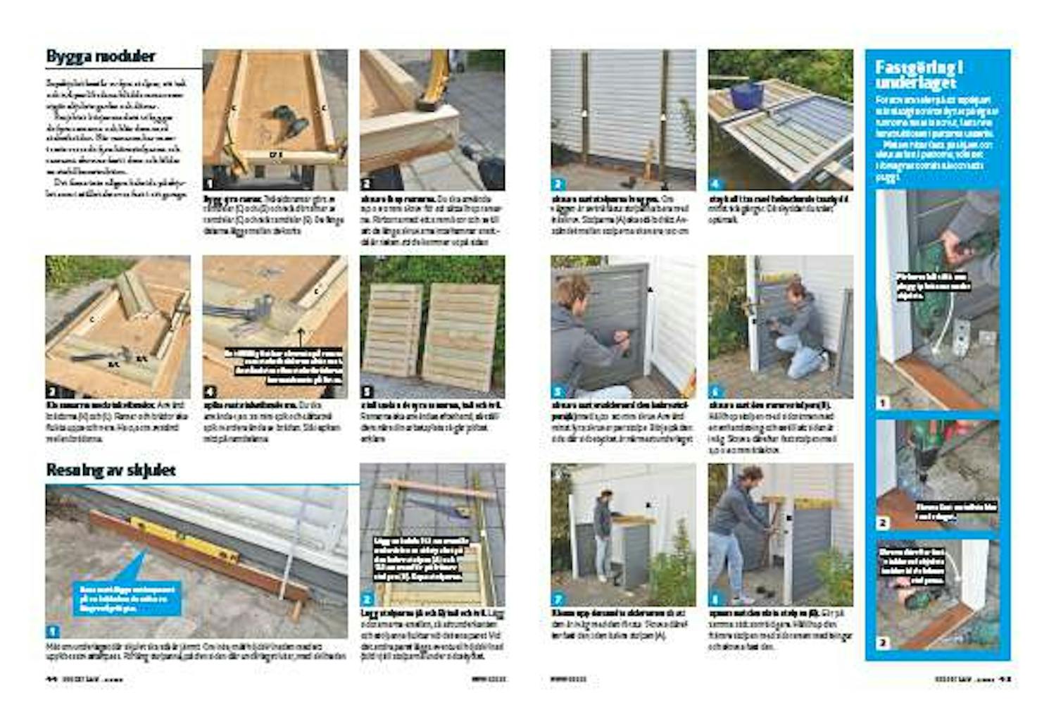 Projektet börjar med att vi bygger de fyra ramarna och klär dem med staketbrädor. När ramarna har monterats reses de fyra hörnstolparna och ramarna skruvas fast i dem och bildar en stabil konstruktion.