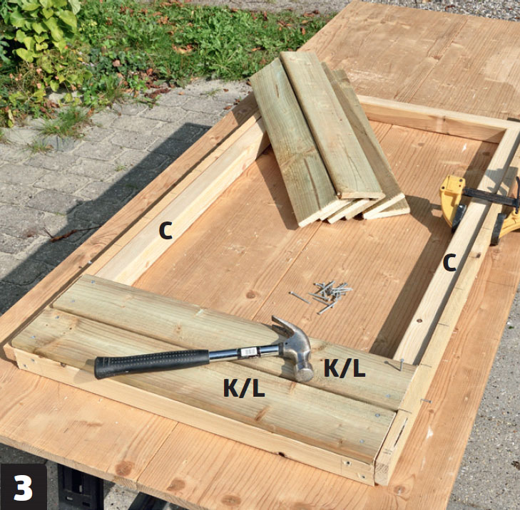 Klä ramarna med staketbrädor. Använd brädorna (K) och (L). Ramar och brädor ska flukta uppe och nere. Ha 0,5 cm avstånd mellan brädorna.