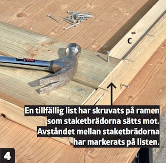 Spika fast staketbrädorna. Du ska använda 1,8 x 35 mm spik och sätta två spik i vardera ända av brädan. Slå i spiken mitt på ramdelarna.