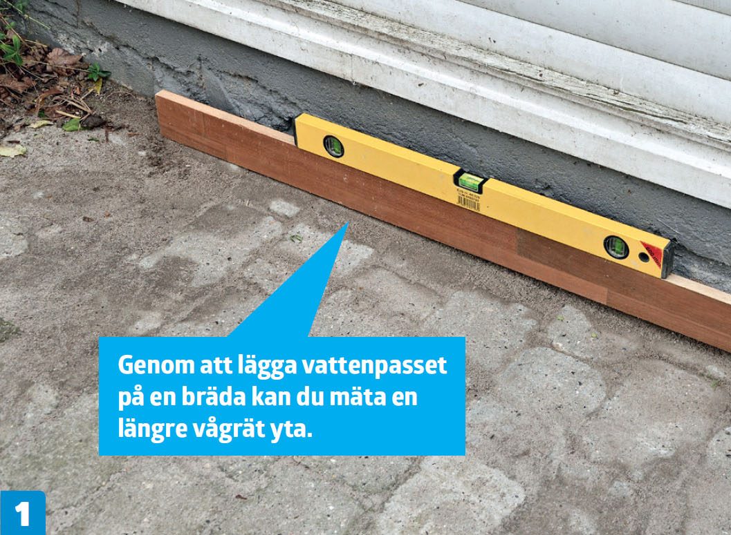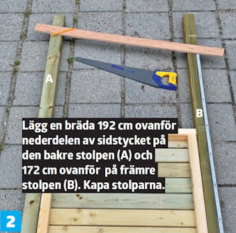Mät om underlaget där skjulet ska stå är jämnt. Om inte, mät höjdskillnaden med ett uppklossat vattenpass. Förläng stolparna, på den sidan där underlaget lutar, med skillnaden.